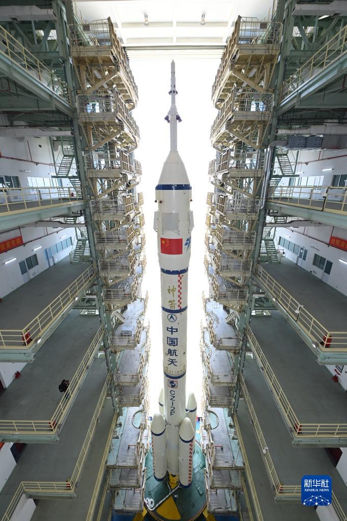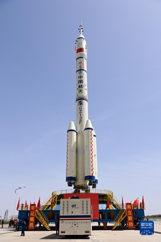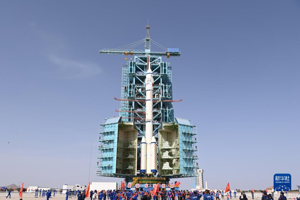 5月22日,神舟十六号载人飞船与长征二号F遥十六运载火箭组合体转运至发射塔架。新华社发(汪江波 摄)