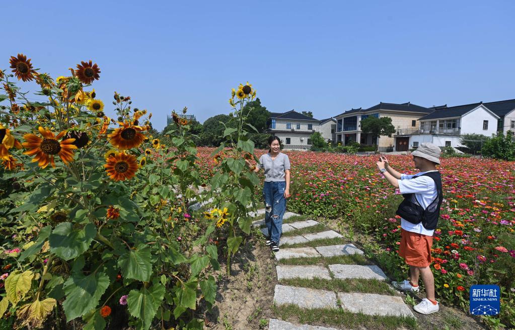 6月14日,游客在织里镇庙兜村的花海里拍照留影。
