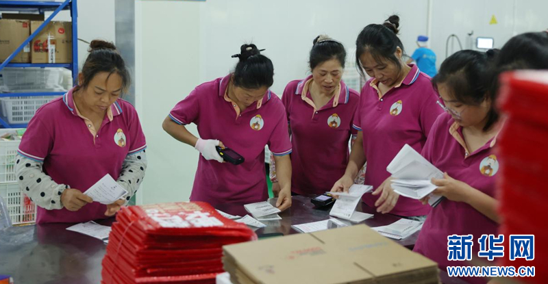 自贡市谭八爷商贸有限公司的包装运输车间内,员工正在整理电商订单。新华网发(李吉 摄)