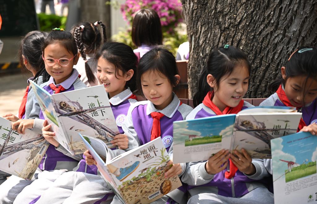 在她的校园里,有一棵“长满书的大树”,挂满了《神笔马良》《西游记》《可爱的中国》等经典书籍。教学楼走廊里、教室里,随处可见各种图书。踏着阅读的阶梯,祖国的花朵茁壮成长。