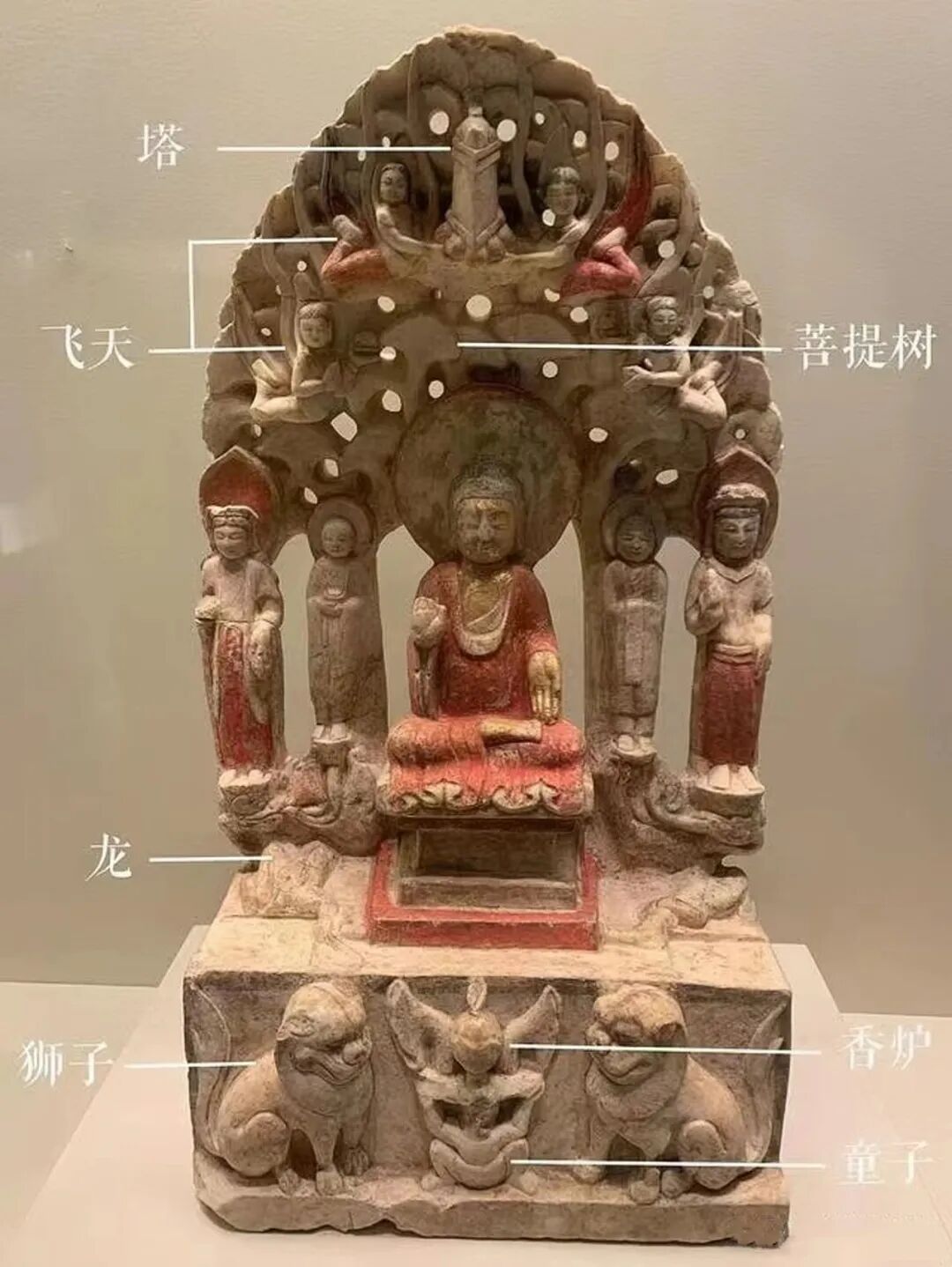 在邺城形成了一种以镂空透雕的双菩提树为背屏,北齐新式佛像为主尊,衬托以龙、塔、飞天、璎珞的“龙树背龛式”造像,学者称其为佛教造像发展过程中的“邺城模式”。
