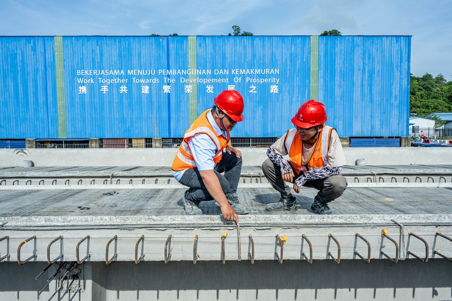 中马共建“一带一路”的标志性项目——马来西亚东海岸铁路(马东铁)建设如火如荼。图为2023年4月26日,在马来西亚吉兰丹州的马东铁项目一分部制梁场,技术主管邓友志(右)和马来西亚本地青年员工邓德纬讨论生产情况。(新华社记者朱炜摄)
