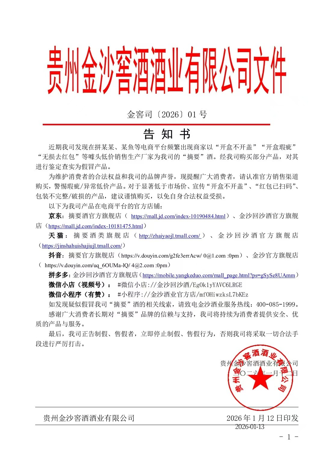 近日,金沙酒业发布2026年1号文件,直指“摘要”假冒市场乱象,据文件显示: